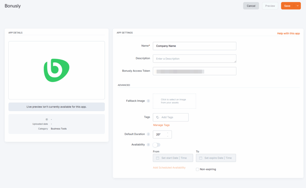 Click on the Bonusly App within your App Gallery to add it, and fill in the app details as follows: