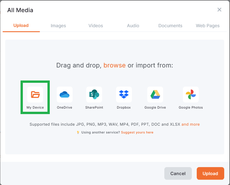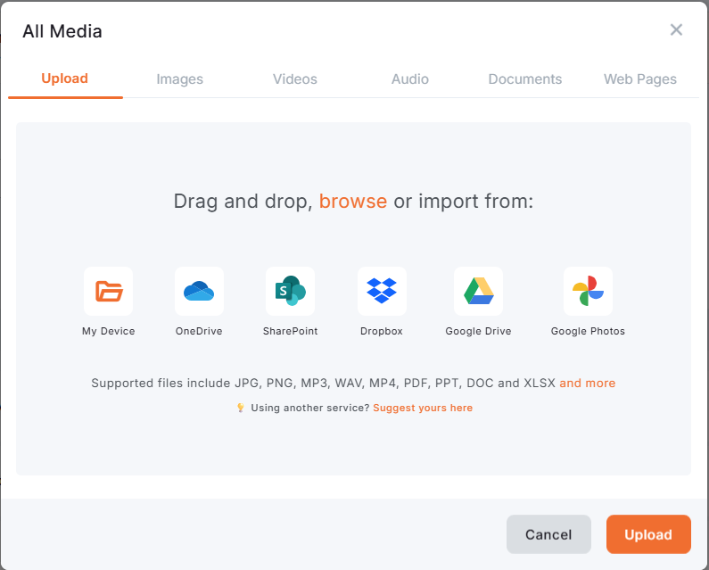 - Import Media from Cloud Storage: The platform lets you import files directly from popular cloud storage platforms such as Dropbox, OneDrive (Business and Personal), SharePoint, Google Drive, and Google Photos. This option allows you to access and use your cloud-stored content instantly within the platform, without downloading it first.