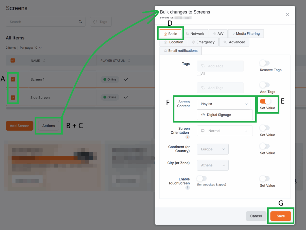 - In the Bulk Changes to Screens window, open the Basic tab.