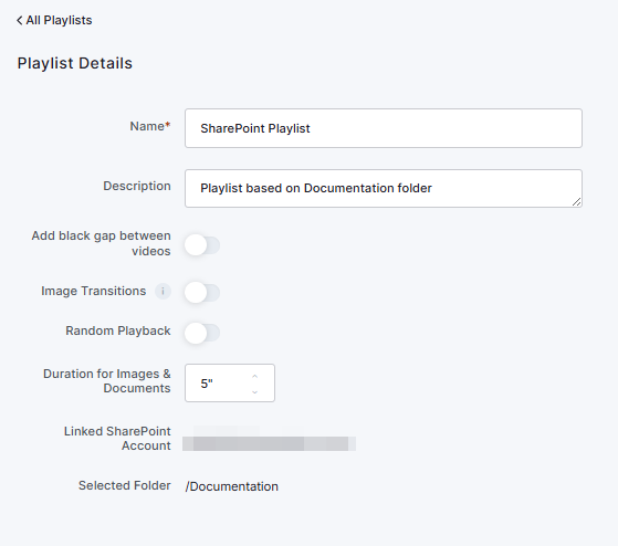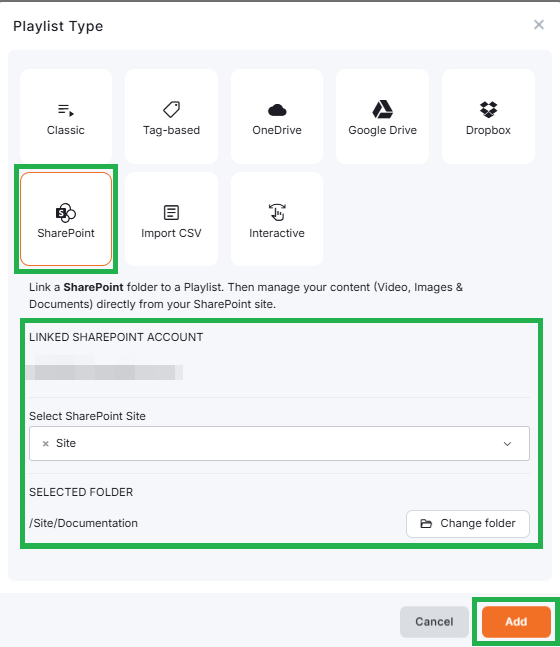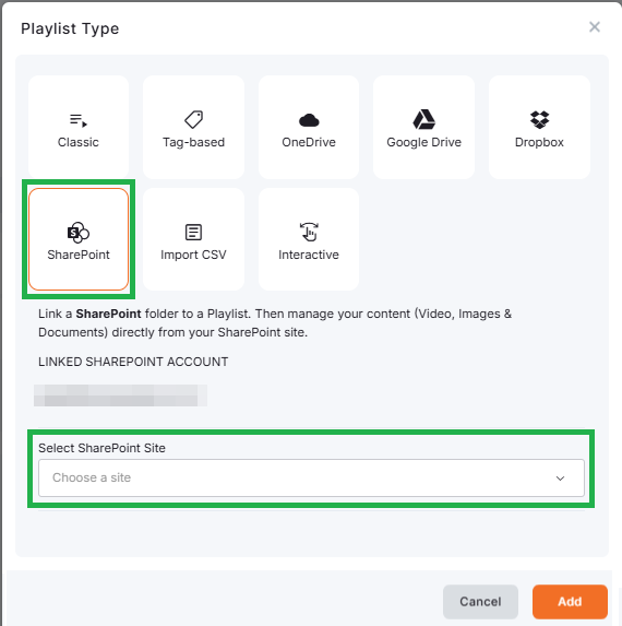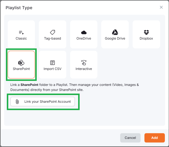 You can link your SharePoint account directly from the Playlists section of your platform’s dashboard.