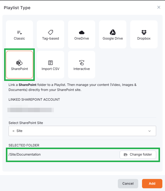 - Selected Folder: Displays the SharePoint folder currently synced with the playlist.