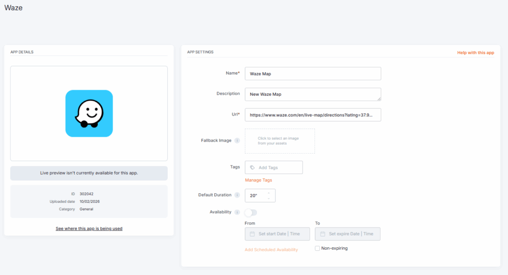 Click on the Waze app within your app gallery to add it, and fill in the app details as follows: